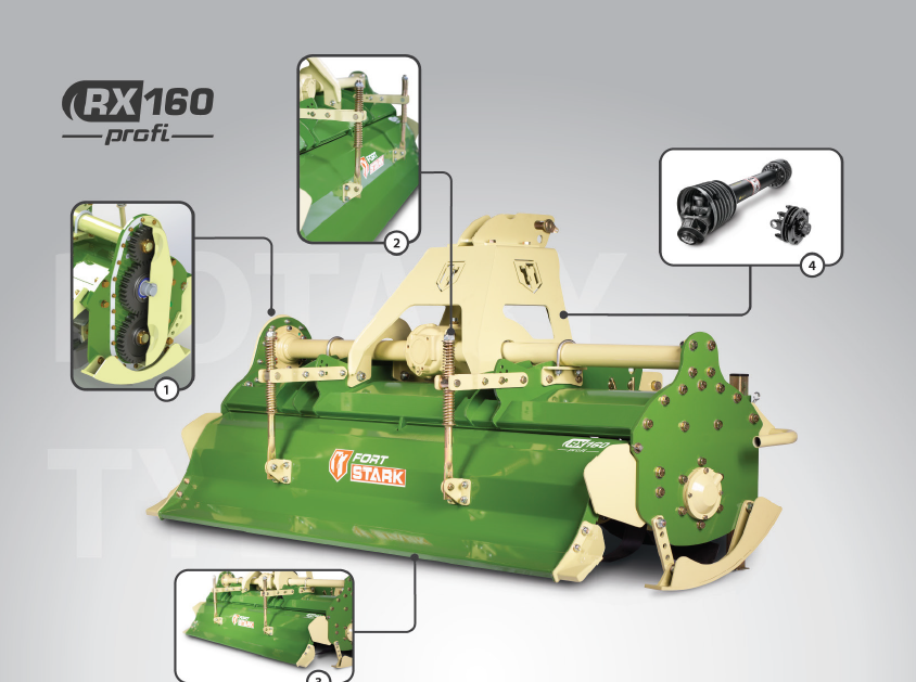 Die äußerst robuste Bodenfräße RX160Profi verfügt über eine Arbeitsbreite von 160 cm. Die Fräße besitzt ein Freilaufgetriebe und einen robusten Zahnradantrieb. Das saubere Fräßbild wird über Zinkenmsser erreicht, die Arbeitstiefe kann in 3 verschiedenen Tiefen eingestellt werden. Die Fräßen werden in Europa gefertigt und haben eine sehr hohe Verarbeitungsqualität das sich auszahlen wird. Die Zinkenmesser können Problemlos getauscht werden. Die Wellen sind durch hochwertige Kugellager gelagert.