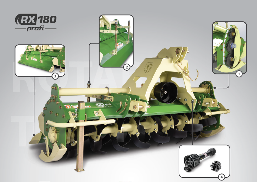 Die äußerst robuste Bodenfräße RX200Profi verfügt über eine Arbeitsbreite von 200 cm. Die Fräße besitzt ein Freilaufgetriebe und einen robusten Zahnradantrieb. Das saubere Fräßbild wird über Zinkenmsser erreicht, die Arbeitstiefe kann in 3 verschiedenen Tiefen eingestellt werden. Die Fräßen werden in Europa gefertigt und haben eine sehr hohe Verarbeitungsqualität das sich auszahlen wird. Die Zinkenmesser können Problemlos getauscht werden. Die Wellen sind durch hochwertige Kugellager gelagert.